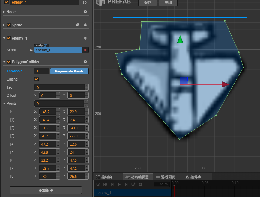 双击预制资源 enemy_1 添加碰撞组件 PolygonColider(多边不规则形) 还有别的圆形 和box形