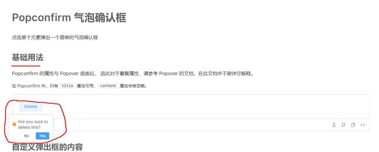 <template> <el-popconfirm title="Are you sure to delete this?"> <template #reference> <el-button>Delete</el-button> </template> </el-popconfirm> </template>