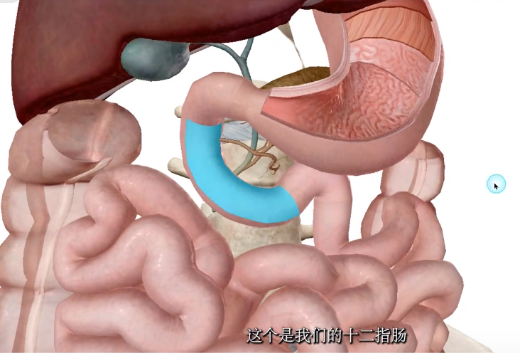 到 12指肠 (12指肠里面有胆总管和胰管的开口(12指肠大乳头)大乳头上方1-2cm处有12指肠小乳头是副胰管的开口,食物在12指肠的胰管产生分解碳水化合物,脂肪,和蛋白质的酶,胆总管也会产生胆汁 胆红素把食物弄成褐色 流入12指肠(没有食物的时候 胆汗存在胆囊里面 浓度会慢慢变得非常高)) 小乳头仅连接副胰管,主要功能是在主胰管受阻时作为备用引流通道,多数情况下不直接参与主要消化活动,